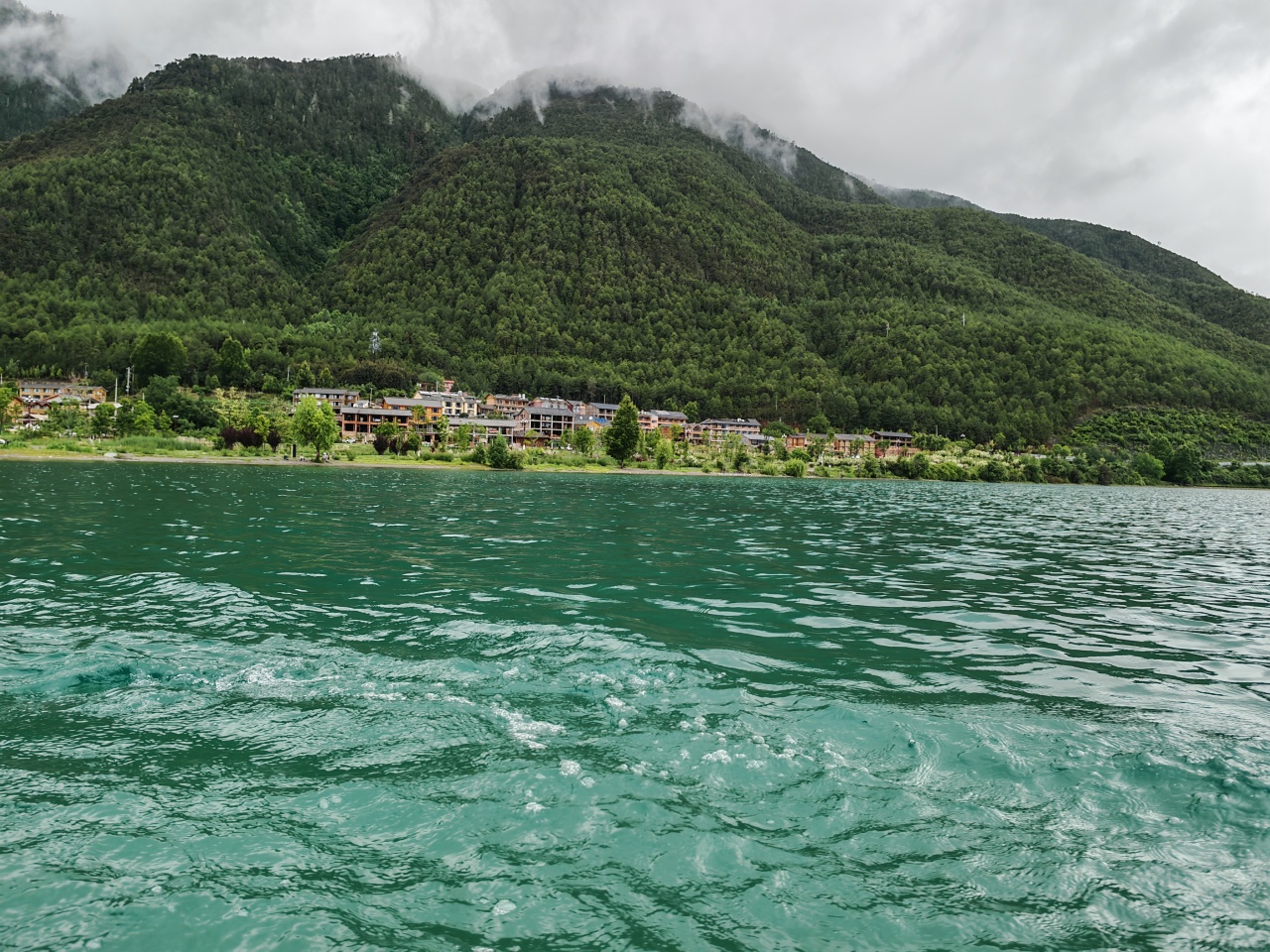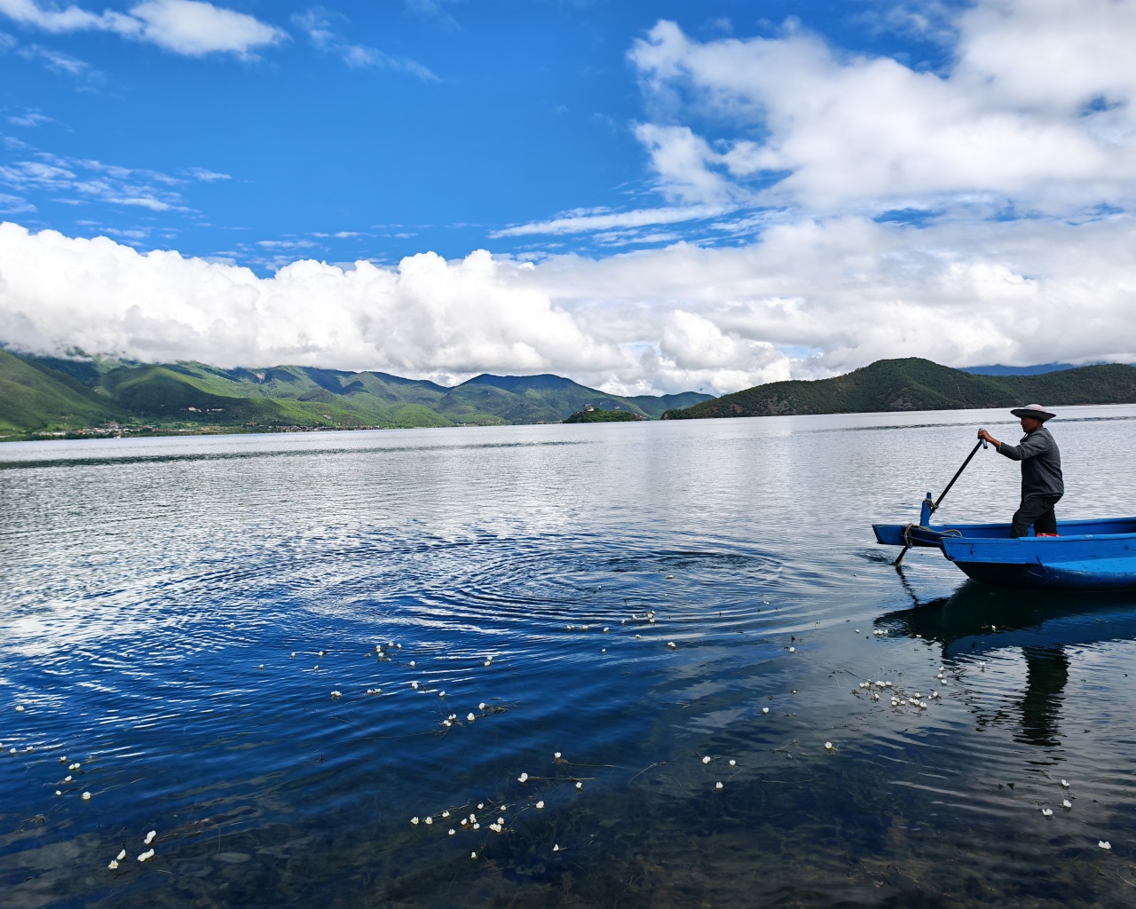 碧蓝的湖水倒映着格姆女神山,猪槽船划过清澈见底的水面,惊起一片水性杨花。摩梭人的彩色经幡在风中轻舞,傍晚的篝火映红了一张张笑脸。这里没有喧嚣,只有飘荡的云朵、悠闲的野鸭,和让人忘却时间的慢生活。