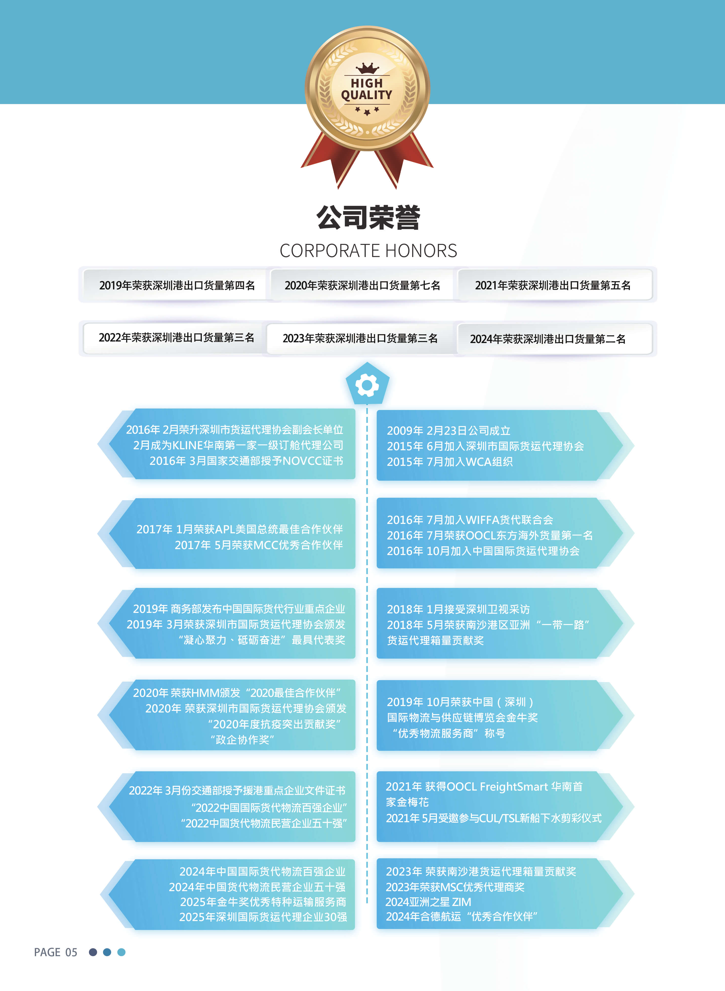 经过十几年发展,现已成为知名度高、实力雄厚的国际出口物流企业。公司在深圳罗湖CBD中心区自有物业2500平方米,拥有员工三百五十多名,服务网路覆盖广东,香港,广西等地区。长期为“一带一路”沿线国家出口贸易提供专业的定制化物流服务(国际货运代理,大件项目物流)。以创新稳健发展荣获“中国国际货代物流百强企业”“中国货代物流民营企业五十强”“深圳国际货运代理企业30强”“深圳市重点物流联系企业”。